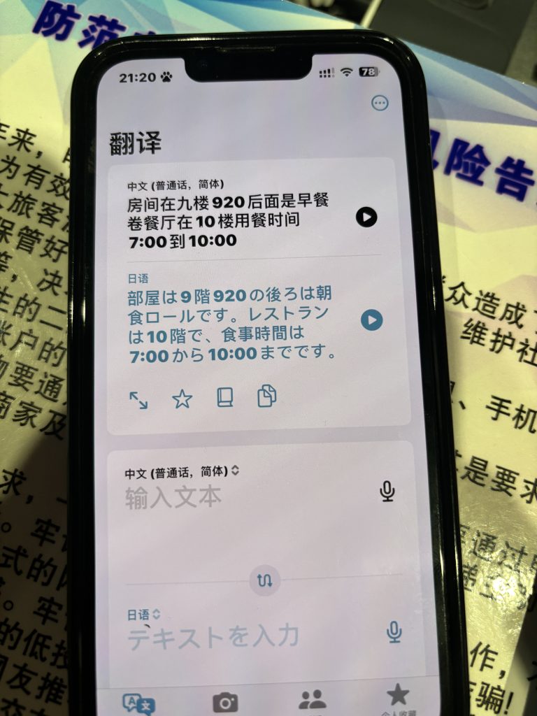 ホテルは一泊朝食付き6500円、結構奮発しました。1万円くらいの部屋にアップグレードしてくれていました。部屋に入るとカーテンが自動で開きます。翻訳アプリ普通に使ってコミュニケーション、便利ですね